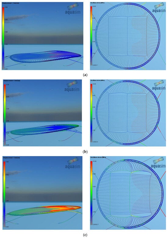 Displacements and von Mises stress distributions in HDPE ring structure for sea states: (a) S1, t = 9 s, (b) S2, t = 12 s, (c) S3, t = 16 s where t indicates the time in AquaSim simulations.
