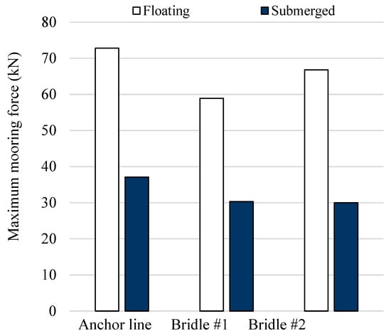 Figure 9 presents tensile forces in the front anchor line, bridle line #1, and bridle line #2 in floating and submerged states for sea state S3. It can be seen that, when the whole ring structure is filled with water and is fully submerged at a depth of 16 m, the mooring forces are reduced significantly. For sea-state condition S3, the tension in the front anchor line is reduced by about 50% by submerging the collar completely. The significant reduction in mooring forces shows an increase in survivability of the mooring-line systems in storm events via submerging the ring structure to dodge the strong surface waves.