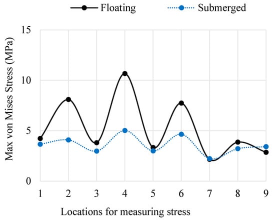 Figure 10 presents maximum von Mises stresses in the ring structure at the nine locations for sea-state condition S3. The maximum stresses are found at the connections with the bridle lines as expected. It can be seen that the stresses can be reduced by about 50% by filling the whole ring structure with water, and letting it sink to 16 m below the water surface.