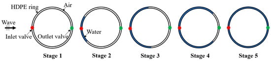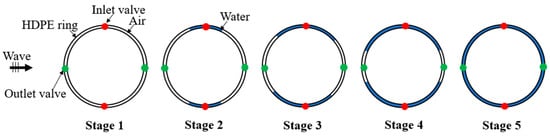 Locations and numbers of valves need to be determined as part of the submergence strategy. This section investigates the effects of using either one or two inlet and outlet waves located in the ring structure on hydroelastic responses of the ring structure. Consider two valve configurations C1 and C2 as shown in Figure 11 and Figure 12. The red circles show the locations of inlet valves, whereas the green circles show the locations of outlet valves. Valve configuration C1 has been adopted in submersible fish cages designed by Badinotti [], whereas valve configuration C2 has been used in the submersible fish-cage design by Aquatec []. For each valve configuration, the responses of the ring structure are determined for five submergence stages, defined by the percentage of the ring structure filled with seawater, as shown in Figure 11 and Figure 12 (from left to right). Stage 1 is the ring structure filled with air (i.e., 0% of seawater). Stage 2 represents 25% of the ring structure filled with water, Stage 3 represents 50% of the ring structure filled with water, State 4 represents 75% of the ring structure filled with water, and Stage 5 represents 100% of the ring structure filled with water.