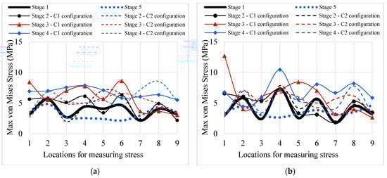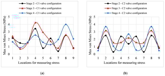 von Mises stresses at various locations of ring structure in calm water: (a) C1 valve configuration, (b) C2 valve configuration.