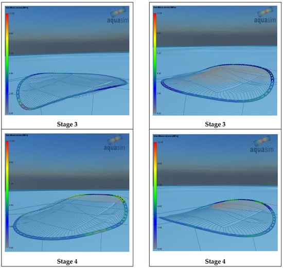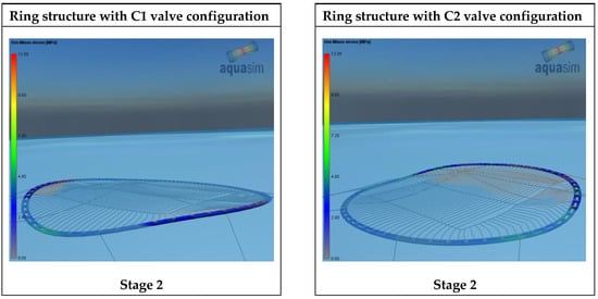Figure 15 shows the deformed state and stress distributions in the ring structure during submergence (i.e., stages 2, 3, 4) in sea state S2. It can be seen that the stress for the ring structure with valve configuration C2 is lower than that for the ring structure with valve configuration C1. The maximum stresses occur at the connections with bridle lines or at the locations of inlet valves.