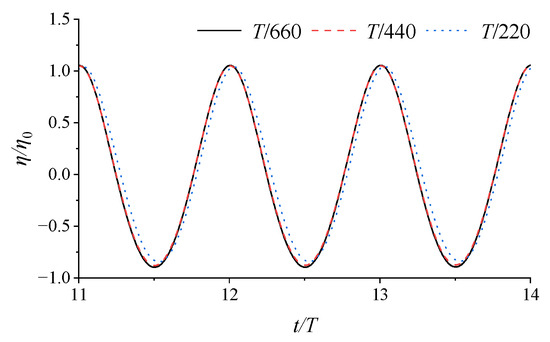 Under the same wave conditions shown in Table 2, time-step convergence of Mesh B was carried out. Based on the principle that the Courant number is less than 1 at free surface, Δt = T/220, T/440 and T/660 are set as time steps, respectively, T is wave period. Figure 4 presents the wave elevation at 3L. It can be found that the wave elevation at Δt = T/220 is significantly lower than that at Δt = T/440 and Δt = T/660, and the wave elevations of Δt = T/440 and Δt = T/660 are basically the same. To balance the accuracy of numerical values and computational cost, Δt = T/440 is adopted in the subsequent calculations.