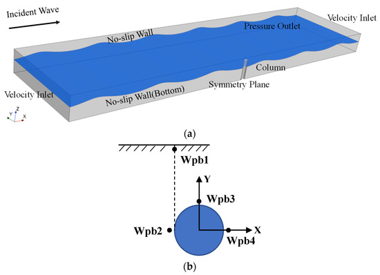 The validity of the numerical model was proved by the comparison of the numerical values with experimental data from Mo et al. [33]. Figure 5a shows the settings of numerical model. The origin of the coordinates of the simulation domain is located at the center of the structure, with z = 0 located at the still water level. The negative x-axis is the direction of the incident wave. As the structure is an axial symmetrical distribution in x-z plane, we use half of the computational domain to reduce the calculation time. The single cylinder with a diameter of 0.35 m is fixed at the bottom of the wave tank. The water depth is 4.76 m. Table 3 presents the parameters of the incident wave. The arrangement of wave probes is plotted in Figure 5b. The specific positions of wave probes are depicted in Table 4, which refers to the experiment to illustrate the validity of the numerical model for wave–object interaction.