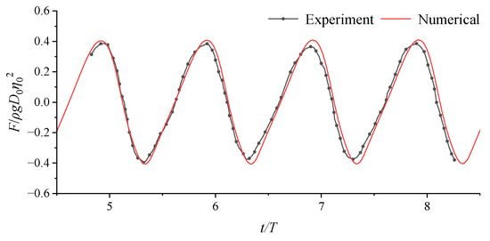 The numerical wave force on the cylinder is compared with the experimental results from Mo et al. [33], and a good agreement can be found in Figure 6.