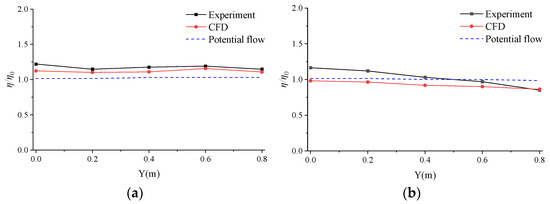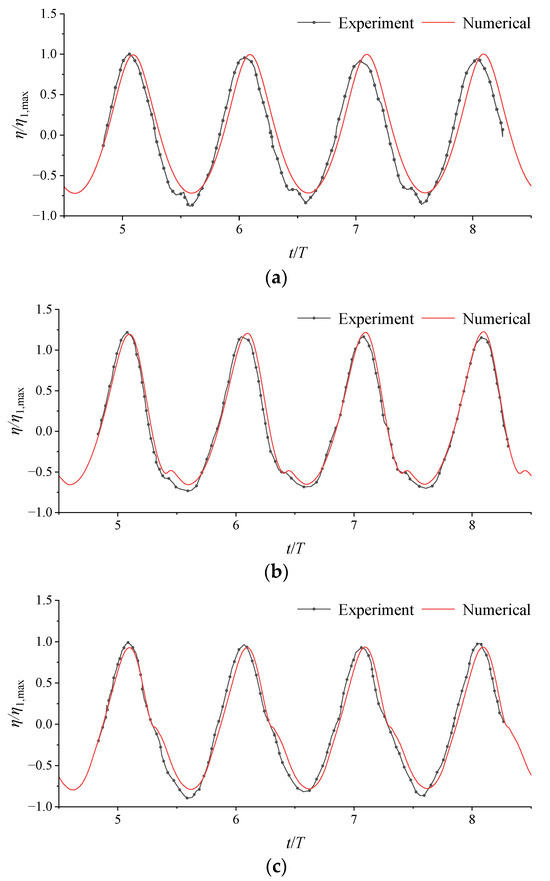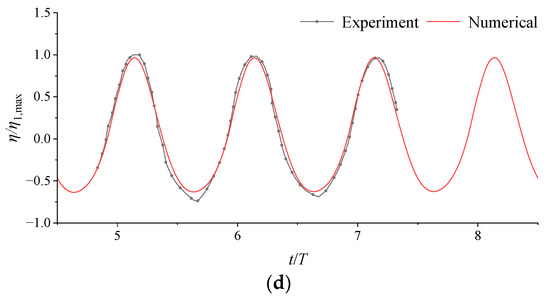 In addition, Figure 7 shows the time history of wave elevations at different wave probes, where η1,max represents the maximum wave elevation in wave probes Wpb1. It is obvious that the numerical data agree well with the experimental results, which shows that the wave–object interaction can be accurately simulated by the numerical model.