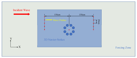 As shown in Figure 8, 5 wave probes are arranged on the weather-side line and lee-side line that parallel to y-axis, respectively, 10 wave probes in all. Each line is 1.5 m away from the center of the structure, and the distance between adjacent wave probes on each line is 20 cm. In addition, a wave probe is set at the center of the structure. The origin of the coordinates is located in the center of the structure, with z = 0 located at the still water surface, and the incident wave is generating and propagating from the left side to right direction along x-axis. The method of forcing is applied to eliminate the wave reflection at boundaries.