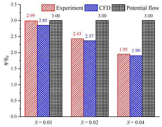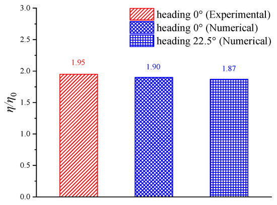 Figure 12 presents the dimensionless wave elevation η/η0 at the central point. For different wave probes, average wave elevation of five wave periods is chosen as the numerical value. The wave elevation calculated by the potential flow theory keeps three times larger than the incident wave elevation. The nonlinear effect of waves enhances with increased wave steepness. The comparison between numerical values and experimental data shows that CFD can simulate the interaction between the SPEC and strong nonlinear waves more accurately.