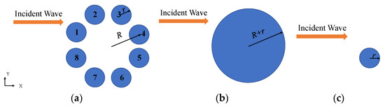 To better describe the self-protection performance of the SPEC, two single cylinders, namely big single-cylinder (rb = R + r = 0.478 m) and small single-cylinder (rs = r = 0.125 m), are considered for comparison, as shown in Figure 13. The drafts of two single-cylinders are the same as that of the SPEC. Figure 13a shows the number of each cylinder of the SPEC.