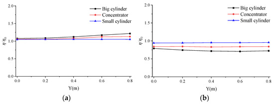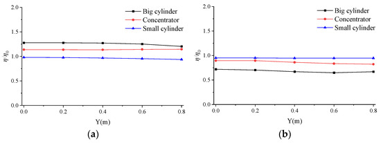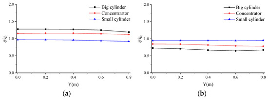 The influence of nonlinear waves on the self-protection performance was studied based on the wave elevations at ten probes outside the SPEC, including the two single cylinders shown in Figure 13a,b. From Figure 14, Figure 15, Figure 16 and Figure 17, it can be seen that the results of the concentrator close to the values of the big single-cylinder gradually with the increase in wave steepness, which shows that nonlinear waves can weaken the self-protection performance of the SPEC.