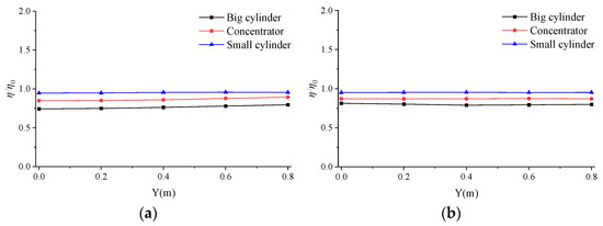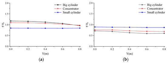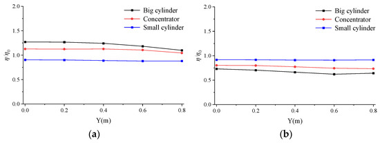 Figure 26, Figure 27, Figure 28 and Figure 29 plot the dimensionless wave elevations (η/η0) outside the concentrator at different wave numbers. To compare the performance, the big single-cylinder (rb = 0.478 m) and the small single-cylinder (rs = 0.125 m) are considered in this section. For k0c = 0.6 m−1 and k0c = 0.8 m−1, the wave elevation of the SPEC is between the results of two single-cylinders. From the results of k0c = 1.2 m−1 case shown in Figure 29, the wave elevation is closer to the value of the big single-cylinder, and the self-protection performance is noneffective on the weather side. In addition, the disturbance of the wave surface outside the concentrator is the largest for the short-wave case (k0c = 1.2 m−1), which verifies the influence of short wave on the self-protection performance.