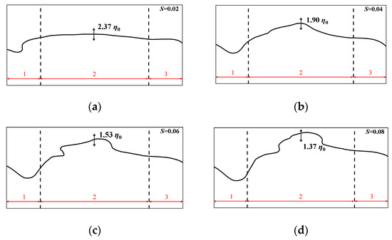 Wave profile along the y = 0 section inside the SPEC under four wave-steepness conditions: (a) S = 0.02; (b) S = 0.04; (c) S = 0.06; (d) S = 0.08.