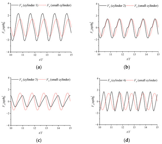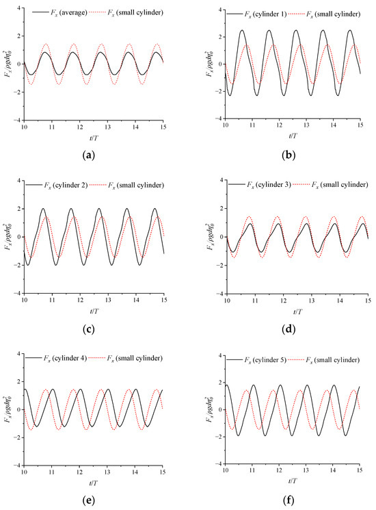 Wave forces on the SPEC: (a) average wave force; (b) cylinder 1; (c) cylinder 2; (d) cylinder 3; (e) cylinder 4; (f) cylinder 5.