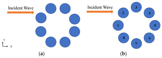 The numerical physical setting shown in Figure 8 includes eight identical truncated cylinders, which are arranged regularly in the form of concentric circles of radius R. The radius of the truncated cylinder is r = 0.125 m, the draft is d = 0.181 m, the length between the center of the array structure and the center of the small cylinder is R = 0.353 m and the water depth is 1.5 m.