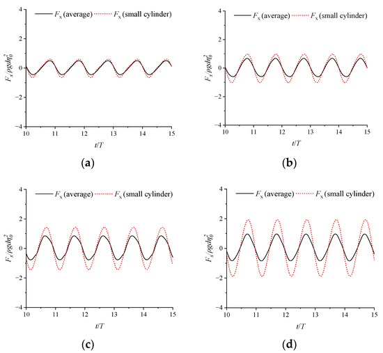 Average wave forces on the SPEC against different wave numbers: (a) k0c = 0.6 m−1; (b) k0c = 0.8 m−1; (c) k0c = 1.0 m−1; (d) k0c = 1.2 m−1.