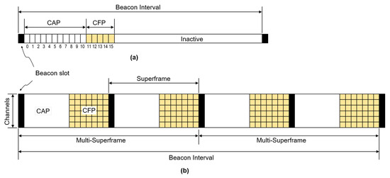 The multi-hop network implemented in this study is based on the IEEE 802.15.4e DSME MAC protocol, which extends the superframe structure defined in IEEE 802.15.4 by introducing multi-superframes. Figure 3 shows the superframe structure for the IEEE 802.15.4 and IEEE 802.15.4e standards. The original superframe structure in the IEEE 802.15.4 standard includes components such as a beacon slot, a Contention Access Period (CAP), a Contention-Free Period (CFP), and an inactive period. In contrast, the IEEE 802.15.4e standard introduces enhancements, specifically the Deterministic and Synchronous Multichannel Extension (DSME). DSME retains the beacon slot for synchronization but enhances CAP and CFP by incorporating a deterministic and synchronized schedule for channel access.