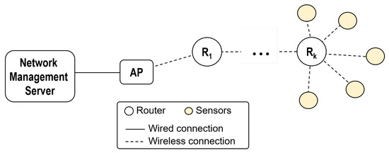 Figure 4 shows the linear multi-hop network topology considered in this paper. The multi-hop network architecture implemented in this study consists of a network management server (NMS), an access point (AP), routers, and end devices. The NMS starts and manages the network, discovers active networks, selects the best channel, and configures network parameters. The AP acts as a central hub, facilitating communication between the NMS, routers, and end devices. A router acts as an intermediary, receiving and relaying sensor data transmitted by the end devices. The end devices collect sensor data and transmit them to the NMS through one or more router(s) and the AP.
