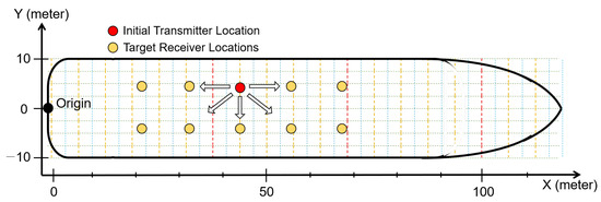 In the first experiment, our goal was to determine the coverage of the radio signal throughout the ship. After selecting the initial transmitter location, we initiated the RSSI measurements by sequentially changing the receiver location, starting with nearby points and moving outward. After completing the measurements at one tranmitter location, the measurements moved to the next receiver location. The measurement steps are shown in Figure 5. The ship’s floor plan is represented on a Cartesian coordinate system. The X-axis represents the longitudinal direction of the ship, from the stern (X = 0) to the bow (X = 120 m). Meanwhile, the Y-axis represents the transverse direction, with the right side of the ship labeled Y = −10 m and the left side labeled Y = 10 m. In the future, only numerical values without units will be used to represent X or Y coordinates in this paper.