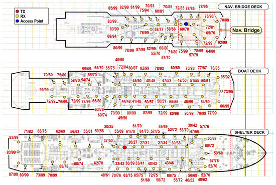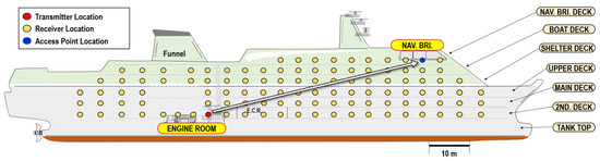 Figure 6 shows the receiver locations on each level, along with the transmitter location in the engine room and the access point (AP) location on the navigation bridge. While varying the transmitter locations, an effort was made to position the receivers at or near the marked points in the diagram.
