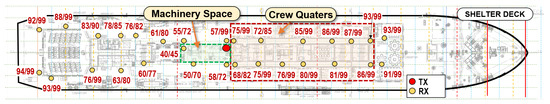 In our signal strength measurement, we began from the second deck, which houses the engine room and the engine control room. As shown in Figure 10a, the transmitter is positioned at coordinates X = 56, Y = 5 within the second deck, specifically inside the engine room (Tx).