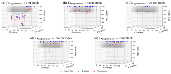 The measurement results in Figure 10b–e provide an overview of the RSSI measurements obtained from different decks of the ship. Each figure corresponds to a specific deck, namely the main deck, the upper deck, the shelter deck, and the boat deck. Throughout these figures, the transmitter is located in the engine room.