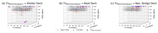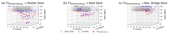 On the main deck (in Figure 10b), sub-1 GHz is still around −70 dBm, but 2.4 GHz almost fails to reach this area and is recorded as −99 dBm. The received signal strength decreases on the upper deck, shelter deck, and boat deck.