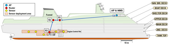 Figure 13 shows the installation layout for the data acquisition experiments in the ship’s test environment. The network management server (NMS) was installed on the laptop to set up a DSME network. It allocates channels and time slots for the entire network based on available guaranteed time slots (GTSs) and sets up routing paths. Router was installed on the shelter deck corridor in close proximity to , which was installed in the engine room. was installed in the engine room. We also placed several sensors around the engine room to verify that the data was successfully collected from the navigation bridge.