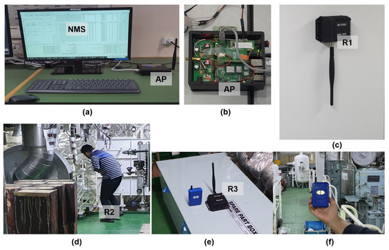 Device placements for the experiment. (a) The network management server (NMS) and the access point (AP). (b) Inner structure of AP. (c) Router positioned on the hallway wall. (d) Router positioned inside the machinery space. (e) Router inside the engine room and (f) sensor device.