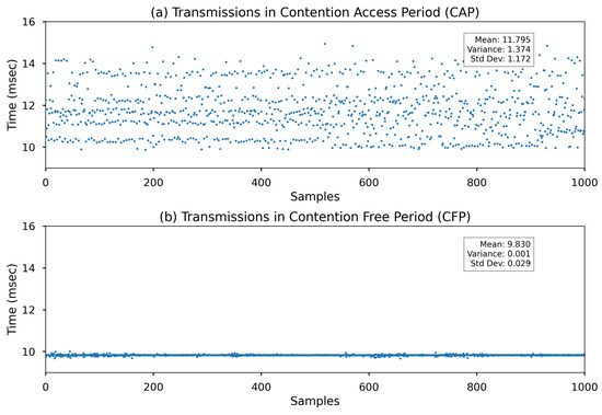Transmission results of (a) the Contention Access Period (CAP) and (b) the Contention-Free Period (CFP), respectively, represented in terms of inter-packet arrival time.