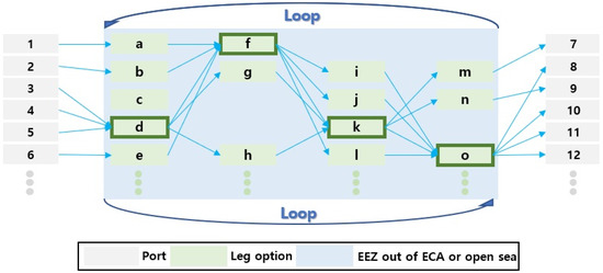 The ECR concept proposed in this study is based on the characteristics of liner shipping that operates regularly on a fixed route as a policy target. The recommended speeds for container ships sailing in the ECR areas are based on the VSRP speed ranges in effect at the Port of LA and the Port of LB in the United States, and at the Ports of Busan, Incheon, Ulsan, Yeosu-Gwangyang, and Pyeongtaek-Dangjin in Korea. Figure 2 illustrates the concept of the ECR, and lag d, lag f, lag k, and leg o are designated as ECR domains in which recommendations about speed reduction are at a certain level.