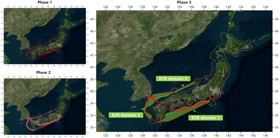 The container vessels freely navigate the waters between the port of origin and the port of destination, taking into account the shortest route and economic efficiency, to provide regular maritime services to the assigned port call. Although the route and activity characteristics for maritime transport prove to be complex, other container ships calling at the same ports also perform maritime transport along similar routes. Thus, characteristic trajectory patterns can be extracted when considering the overall traffic flow. In this study, we used the accumulated historical data from AIS generated by the port calls of container ships between Korea and Japan to comprehensively consider the temporal and spatial characteristics associated with the voyage trajectories of container ships and to perform ECR domain assignment based on kernel density estimation (KDE), a non-supervised method. ECR domains visualize spatial information about the segments that make up a ship route in the form of a geographic distribution.