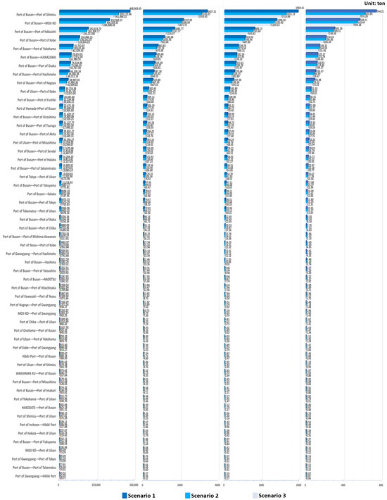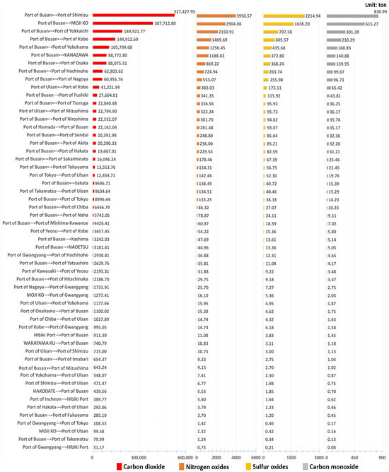A detailed analysis of the emissions estimation based on each ECR scenario was per-formed, combining ship activity data with ship-specific information that reflects the specific conditions per time interval. In detail, Figure 4 and Figure 5 show the estimates of , , , and emissions for the non-ECR case, and scenarios 1–3 demonstrate the ECR broken down based on the port of origin and port of destination. In addition, the total reduction rates for the scenarios of each air pollutant based on the port call considered in this study were calculated, as shown in Table 4. There were 19 port calls that showed a reduction rate of 20% to less than 40%, 26 port calls that showed a reduction rate of 10% to less than 20%, and 10 port calls that showed a reduction rate of less than 10%. The emission reduction rate of the port calls which have more than 50 frequency represent −16.72% (Port of Busan ⟷ Port of Yokohama), −20.60% (Port of Busan ⟷ MOJI KO), −12.26% (Port of Busan ⟷ Port of Kobe), −11.84% (Port of Busan ⟷ Port of Hiroshima), and −22.54% (Port of Busan ⟷ Port of Shimizu), respectively, and the average overall emissions reduction rate for port calls was −17.27%. In other words, the emission reduction effect resulting from the introduction of ECR was found to have wide-ranging effects on overall individual port calls, regardless of the number of port calls between Korean and Japanese ports.