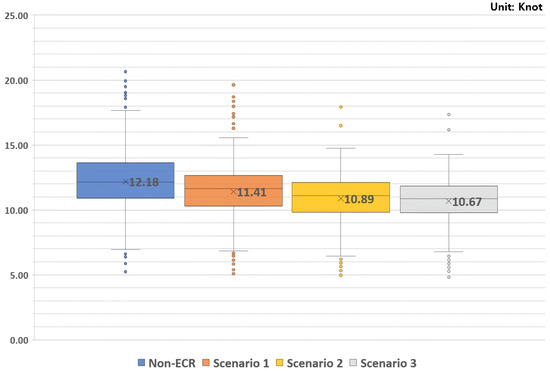 Figure 6 shows the results of analyzing the change rate of linear speed for non-ECR, Scenario 1, Scenario 2, and Scenario 3. Non-ECR ranges from 10.08 to 13.82 knots, Scenario 1 ranges from 9.88 to 12.77 knots, Scenario 2 ranges from 9.82 to 12.50 knots, and Scenario 3 ranges from 9.72 to 12.30 knots. Container ships could achieve higher fuel efficiency by maintaining a constant speed. From the above analysis, it can be concluded that the introduction of the ECR can help improve the fuel efficiency of ships by performing the secondary function of reducing variations in ship speed.