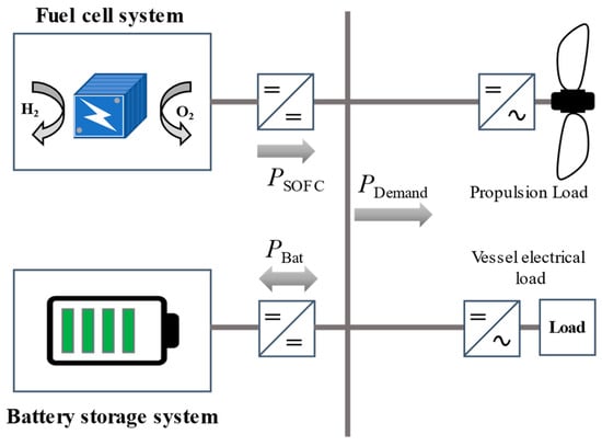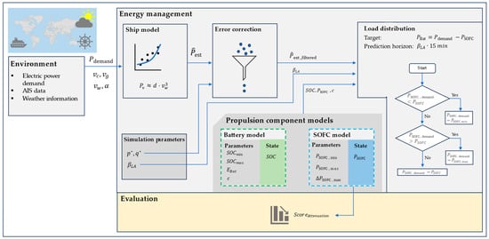 A solid oxide fuel cell (SOFC) is a viable and potentially sustainable alternative to replace conventional means of propulsion because it operates at high temperatures, enabling the utilization of process and excess heat and achieves high electrical efficiencies [7]. In [8], a lab-scale SOFC was operated for more than 100,000 h which proves the longevity of the component under laboratory conditions. SOFCs are particularly relevant for the maritime sector due to their compact design, high power density, and compatibility with various fuels like hydrogen, ammonia [9], or methane [10]. SOFCs operate at elevated temperatures between 600 and 1000 °C [11]. A portion of the process heat and the heat generated from energy conversion within the cells can be utilized in the ship’s heating system, further increasing system efficiency. These features make SOFCs suitable for providing electrical and thermal power for vessels, enabling greater energy efficiency and reduced greenhouse gas emissions compared to conventional ICE-powered propulsion systems. SOFCs have a comparably slow responsiveness towards electrical load changes, which was investigated by Obara et al. in [12]. Therefore SOFCs are typically supported by secondary power sources such as LIBs or supercapacitors to compensate for the low dynamic capabilities of the SOFC depending on the application [13]. Zhang et al. [14] have studied the utilization of SOFCs coupled with supercapacitors in microgrids and considered the slow dynamic responsiveness in their energy management development without utilizing additional data sources to forecast load events or applying machine learning to reduce stress factors on the SOFC. However, their work has not followed a generic approach for the implementation of the EMS and therefore cannot be easily adapted to other applications. Wu et al. [15] studied an SOFC–engine hybrid power system, which could be used in marine applications due to the fuel flexibility of SOFCs. Their approach does not eliminate local emissions and the dynamic load components that cannot be provided by the SOFC might not be compensated by the motor.