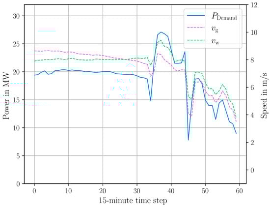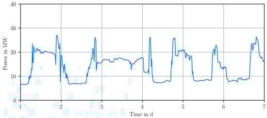 A section of the load profile, which was used as a basis for the development of energy management, can be seen in Figure 2. The data set comprises a measured load profile of a large cruise ship from 2019. The sample rate is 15 min. At the harbor, the investigated cruise ship has a total electrical power demand below 10 MW (where PHotel is dominant). At sea or during maneuvering, the total electrical power demand is above 10 MW. The harbor mode can be repeatedly observed in Figure 2, e.g., between t = (2, 3). At sea, the total electrical load demand mainly depends on speed and weather conditions. Specifications of the cruise ship are shown in Table 1.
