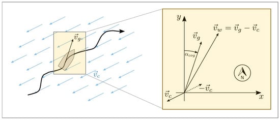 On the left side of Figure 3, a schematic drawing of a ship traveling through the water at a certain speed over ground vg is shown. This speed can be determined, for example, using a satellite navigation system such as a Global Positioning System (GPS). At the same time, the ship is exposed to the velocity of ocean currents, which is indicated by vc in Figure 3. The water resistance in such a case does not result directly from the speed over ground vg, but from the actual speed of the ship through water, which is influenced by the currents. In the right part of Figure 3, it is shown how to calculate the velocity through the water vw as the difference between the velocity vectors vg and vc.