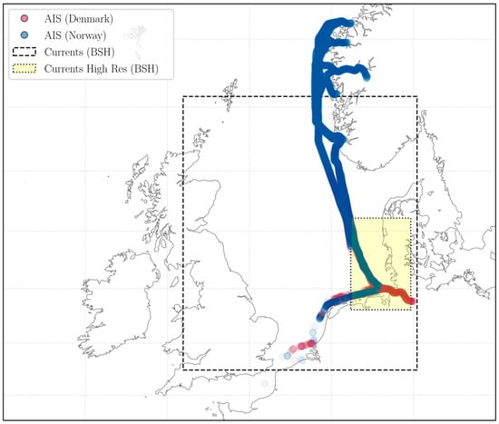 As described above, many vessels continuously transmit position, speed, and other cruise data via the AIS system. This data is not only continuously provided to other ships but also collected and archived by government agencies and numerous commercial organizations. Since the investigated cruise ship was underway in areas of the North Sea, where a good data basis was present, the development and verification were restricted to this region. The archives listed in Table 2 were considered. In the period from April to October 2019, the vessel was cruising in European waterways. The route of the vessel during parts of this period known from the AIS data is shown in Figure 4. In Figure 4, areas for which flow data from the Federal Maritime and Hydro-graphic Agency of Germany (German: Bundesamt für Seeschifffahrt und Hydrographie, short BSH) were received are shown in addition to AIS data.