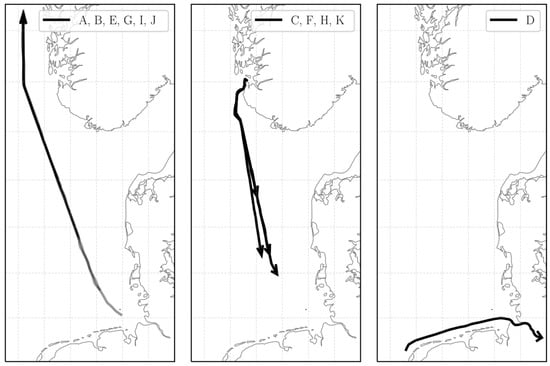 Visualization of the selected episodes of the investigated cruise ship on the North Sea coast of Germany, the Netherlands, Denmark, and Norway, of Group I (left), Group II (center), and Group III (right); the routes are indicated by black arrows.