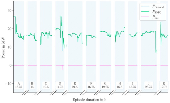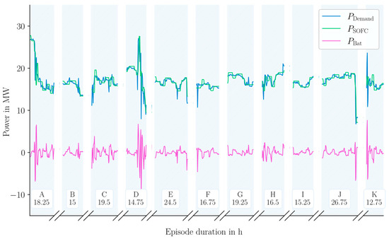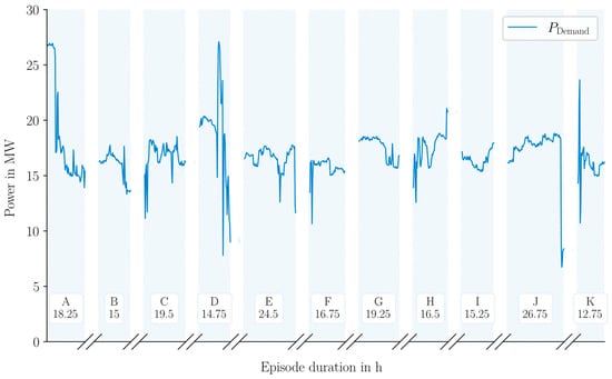 Measured 15 min load demand of episode A–K. The individual episodes are highlighted in light blue and separated by break intervals which are scaled equally.