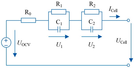 The open circuit voltage of the battery, which can be measured without an applied load at the terminals of the battery, is the result of the internal structure of the battery and mainly depends on the state of charge, which is given as a percentage value between 0 and 100% and can be compared to a fuel level indicator of a vehicle. can be measured when no load is connected to the battery and all diffusion processes have completely decayed. As soon as the battery is charged or discharged, the output voltage of the battery rises or drops due to the voltage drop across the elements of the ECM [40]. In the unloaded state, and are equal. The electrical parameters of the battery can be found in Table 4. The voltage across the parallel connection of resistance and capacitance is calculated as follows: