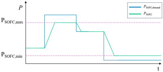 Given that the EMS strategies are deployed on certain test sets, a simple modeling of the SOFC is sufficient, which does not consider reactions such as heat conversion. Figure 8 shows a qualitative illustration of the fuel cell’s output power PSOFC which follows the power demand signal PSOFC,demand considering the safe boundaries of operations within the interval (PSOFC,min,PSOFC,max) and the limit of the rate of change of the output power. The maximum dynamic rate to operate the fuel cell is set to .