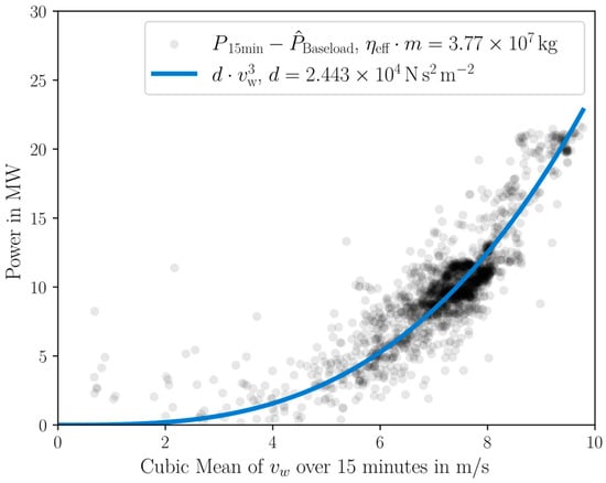 Equations (7) and (9) form a system of equations, whose only unknown constants are , , and . With the help of the least squares method, a curve is fitted to obtain the empirical relationship between the recorded velocity of the ship vw, and the power demanded for propulsion, which can be seen in Figure 12. The values and are obtained. Assuming an efficiency of the drive train of , including the transmission of power through the ship’s propeller, a mass of is obtained, which may correspond to the estimated displacement weight of a cruise ship. The exact mass of the ship is not known, but the order of magnitude is plausible.