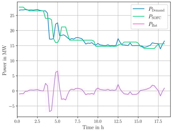 here represents the time-dependent charge or discharge factor of the battery with hysteresis. is hereby a constant charge or discharge power, which varies according to the SOC. The essential idea of this strategy is that the energy management method attempts to meet the total load demand with the SOFC, and that the battery is used to balance the differential load in case the SOFC cannot respond sufficiently to dynamic load events. Since, with such a strategy, the battery could either continue to become increasingly discharged or fully charged over time, depending on the load demand, there is still compensation if the SOC falls outside the safe operating windows. Therefore, the safe operating depth of discharge can be kept low to avoid a sudden reach of the end of charge or discharge voltage, e.g., within 30% to 70% SOC. Figure 9 shows a simulation of this strategy using the load profiles and the models described in the fundamentals.