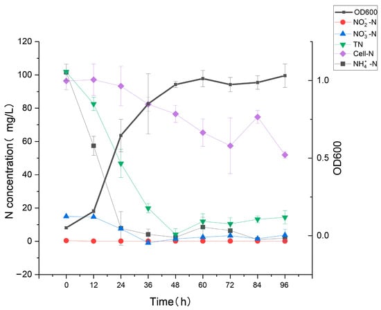 Strain HN1 with highest nitrogen removal activity among the isolates was cultured in 100 mL sterile HNM2 medium at a temperature of 30 °C, a rotational speed of 120 rpm, and an inoculum size of 1% (v/v). Samples were collected and measured every 12 h to determine the concentrations of NO3−-N, NO2−-N, NH4+-N, TN, and OD600 by the methods in Section 2.6. In addition, the intracellular nitrogen content was calculated by subtracting the TN of the centrifuged medium (5000 r/min at 10 °C for 15 min) from that of non-centrifuged medium based on previous research results [].