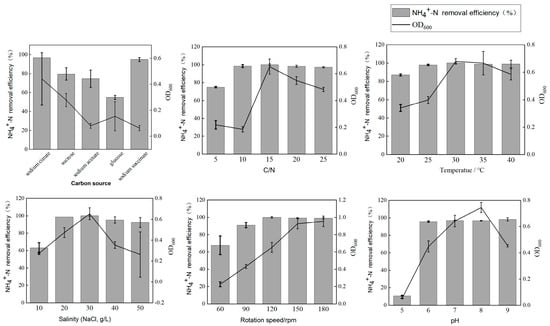 Growth and NH4+-N removal of strain HN1 under different conditions. The error bars mean the standard deviations.