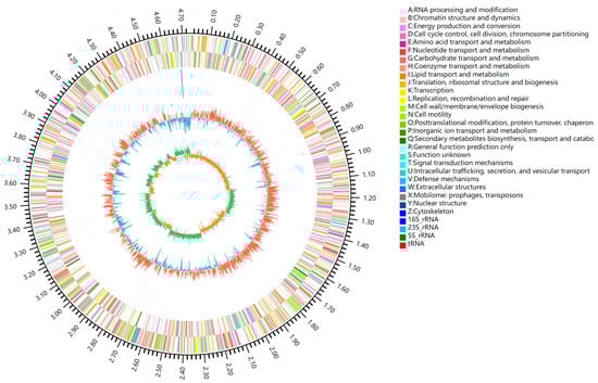 The complete genome sequence of HN1 was 4,736,451 bp and was deposited in the GenBank database under the BioProject Number of PRJNA1025341. Among them, GC content accounts for 61.38% (Figure 4). A total of five genomic islands (GIs) and 4239 genes were forecasted in the genome of HN1. In order to thoroughly clarify the metabolic pathway of nitrogen removal in HN1, the coding genes of all key enzymes related to the nitrogen metabolism process were counted; the results are shown in Table 1. For genes encoding key enzymes involved in the HN-AD process, narG, nirS, norB, nosZ, nirB, and nasA genes were annotated in strain HN1 with the denitrification process gene intact. In contrast, the genes encoding ammonia monooxygenase (AMO) and hydroxylamine oxidase (Hao) have not been discovered, and the nitrification process was missing, presumably as a possible novel pathway (Figure 5). Meanwhile, catalyzed by glnA and gltB genes, ammonia was converted to glutamate, which enters the glutamate cycle. Combined with nitrogen balance analysis, half of the external nitrogen source was assimilated into intracellular nitrogen. Therefore, the expression of key genes indicates that there may be two possible nitrogen removal methods for strain HN1: heterotrophic nitrification–aerobic denitrification and nitrogen assimilation.