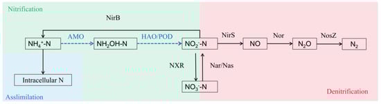 In recent years, exogenous nitrogen-containing pollutants substantially increased with the acceleration of urbanization and industrialization, as well as the continuous development of intensive aquaculture. The excessive discharge of nitrogen-containing pollutants caused eutrophication and frequent occurrence of red tides in marine environments, leading to an ecological imbalance and threatening human health []. Aerobic autotrophic nitrification and anaerobic heterotrophic denitrification were included in traditional biological denitrification processes to remove the pollution []. Nitrification was the sequential oxidation of ammonia to nitrite and nitrate by autotrophic microorganisms under aerobic conditions, and denitrification was the process in which heterotrophic microorganisms reduced nitrate to nitrogen under strict anaerobic conditions [].