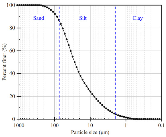 The particle size of the mud was determined using a laser particle size analyzer, and the particle size distribution curve is shown in Figure 1. Based on the Unified Soil Classification System [32], the mud could be categorized as fat clay (CH). Additionally, the mud composition was analyzed using the 09 Empyrean X-ray diffractometer. This mud was composed of quartz, kaolinite, illite, smectite and mica. The composite solidification agents chosen for this experiment were the 425# OPC and GGBS. The flocculants used in the experiments were AN926SH anionic polyacrylamide (APAM) solution and Ca(OH)2. APAM is a widely employed substance in various industrial fields like water treatment, sludge dewatering, and the paper industry [33,34,35]. In this experiment, the APAM solution was prepared at a concentration of 1:500 (mass ratio of dry APAM powder to water). The APAM dose was defined as the dry weight ratio of APAM powder to the dry soil particles. Ca(OH)2 can be consumed by GGBS; the hydration products improve the solidification effect [36].
