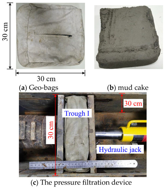 - A specially developed device is used, as shown in Figure 2. This device is similar to a piston, through which the mud slurry can be dewatered, as demonstrated in the relevant standard [40]. Pour the mixed slurry into a geo-bag using a funnel and close the zipper. Then, place the geo-bag in trough I and secure the cover plate on top of the pressure chamber using high-strength bolts. The material chosen for the geo-bags in this test was polypropylene fiber, which effectively prevents the seepage of mud particles and exhibits good permeability. The geo-bags had a planar dimension of 30 cm × 30 cm, and the maximum thickness was 20 cm. The aperture diameter of the geo-bags was 48 um.