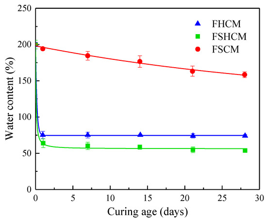 The experimental results of Group A are illustrated in this section to demonstrate the feasibility of FSHCM. Figure 3 depicts the relationship between water content and curing age for the mud samples treated using FSHCM, FHCM, and FSCM, respectively. When the curing age was less than 1 day, FSHCM had the best effect of dewatering, with the lowest sample water content. FHCM yielded a slightly higher water content compared to the former. FSCM, on the other hand, had the poorest effect of dewatering, with water contents significantly higher than those of the first two methods. FSHCM-MS, FHCM-MS, and FSCM-MS represent mud slurries treated by flocculation-solidification-high pressure filtration combined method, flocculation-high pressure filtration combined method, and flocculation-solidification combined method, respectively. When the curing age was longer than 1 day, the water content of FSHCM-MS decreased slowly. FHCM-MS showed almost no change in water content, while FSCM-MS exhibited a faster decrease in water content. The higher the dose of composite solidification agent, the more pore water was consumed by chemical reactions, resulting in a more significant decrease in the water content of the samples. FSHCM can reduce the water content of the marine mud slurry to a relatively low level through flocculation and high-pressure filtration. During the curing process, the water content of marine mud slurry is further decreased by the consumption of pore water. FSHCM has advantages both in terms of dewatering and material savings.